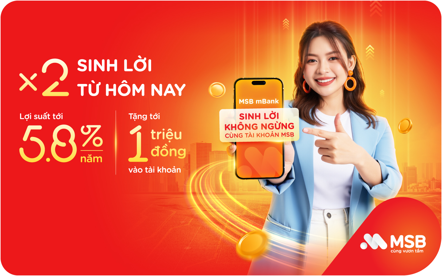 To double the benefits when participating in profit generation on the MSB mBank application, MSB is offering a special combo program with a 5.8% yield + a gift of 1 million VND (conditions apply to first-time participants in profit generation with an MSB account).