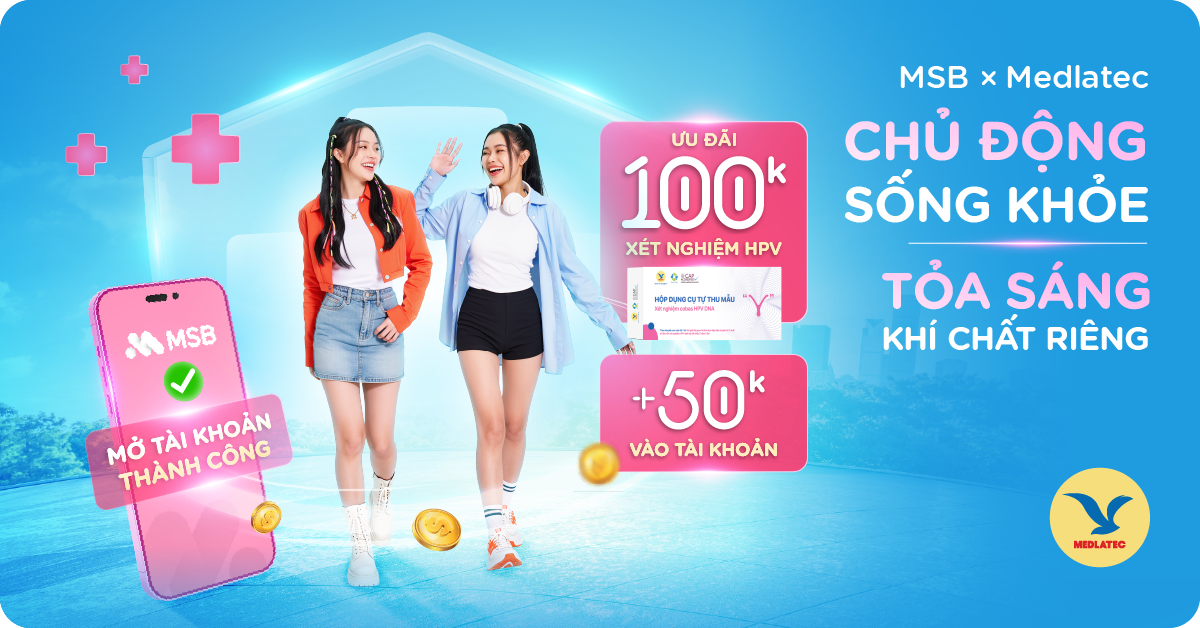 Content: Receive a 100,000 VND e-voucher for the Medlatec self-sampling HPV test kit for cervical cancer screening (*) and 50,000 VND credited to your payment account.