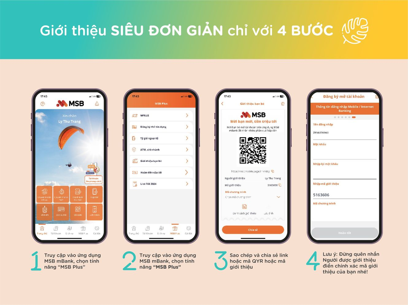 Ngoài ra, người được giới thiệu được thưởng (tặng) thêm 50.000 VNĐ/1 tài khoản khi thực hiện giao dịch nhanh từ 300.000 VNĐ qua ứng dụng MSB mBank và duy trì số dư bình quân tháng từ 1 triệu đồng.