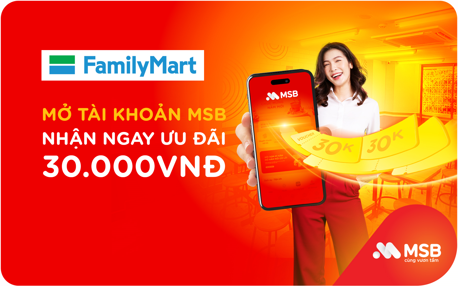 Đặc biệt, từ nay đến 31/12/2025, khách hàng khi mở tài khoản thanh toán MSB tại 160 cửa hàng FamilyMart trên toàn quốc sẽ nhận được ưu đãi 30.000 đồng vào tài khoản và được giảm giá ngay cho đơn hàng chi tiêu tại Family Mart.