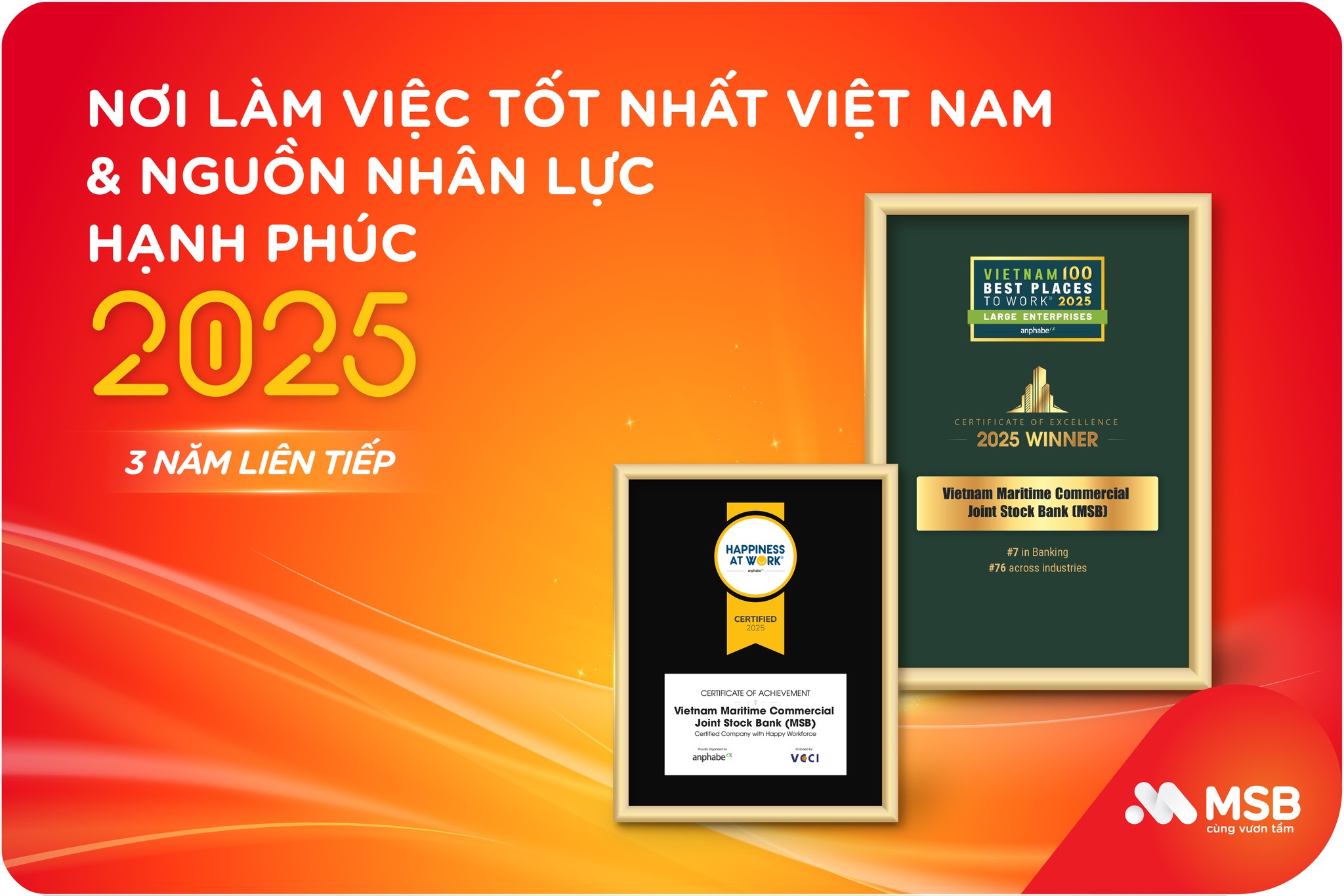 Đây là năm thứ ba liên tiếp MSB được ghi nhận, khẳng định chiến lược nhân sự được xây dựng nhất quán, thực thi nghiêm túc và liên tục cải tiến.
